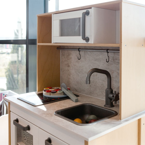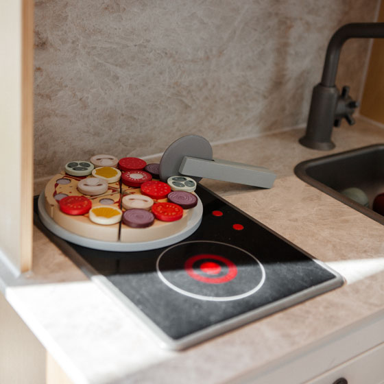 Detailaufnahme von Kinderspielküche mit Arbeitsplatte und Rückwand aus Keramik pureto Mahal Beach