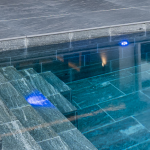 Wird die Trittstufe mit Fliesen verkleidet, bringen Bodenfliesen schon die nötige Rutschhemmung und Abriebklasse mit sich.